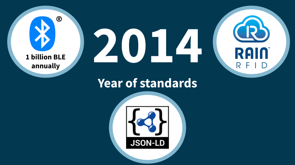 Since then there have been over 112 billion RAIN RFID tags produced and there are currently 5 billion Bluetooth Low Energy devices shipping annually. The problem of standard, accessible hardware is very much solved: we can identify and locate 100 billion+ “things” across the planet! Moreover, with Google embracing JSON-LD and Schema.org to represent anything as machine-readable data, all those things can be associated with web-standard digital twins!
